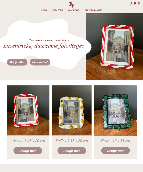 Bij dit project heb ik ervoor gekozen om gebruik te maken van tweedehands producten. Door fotolijsten her te gebruiken, ontstaan er nieuwe, unieke objecten die langer meegaan. De lijsten zijn weergegeven in een webshop.